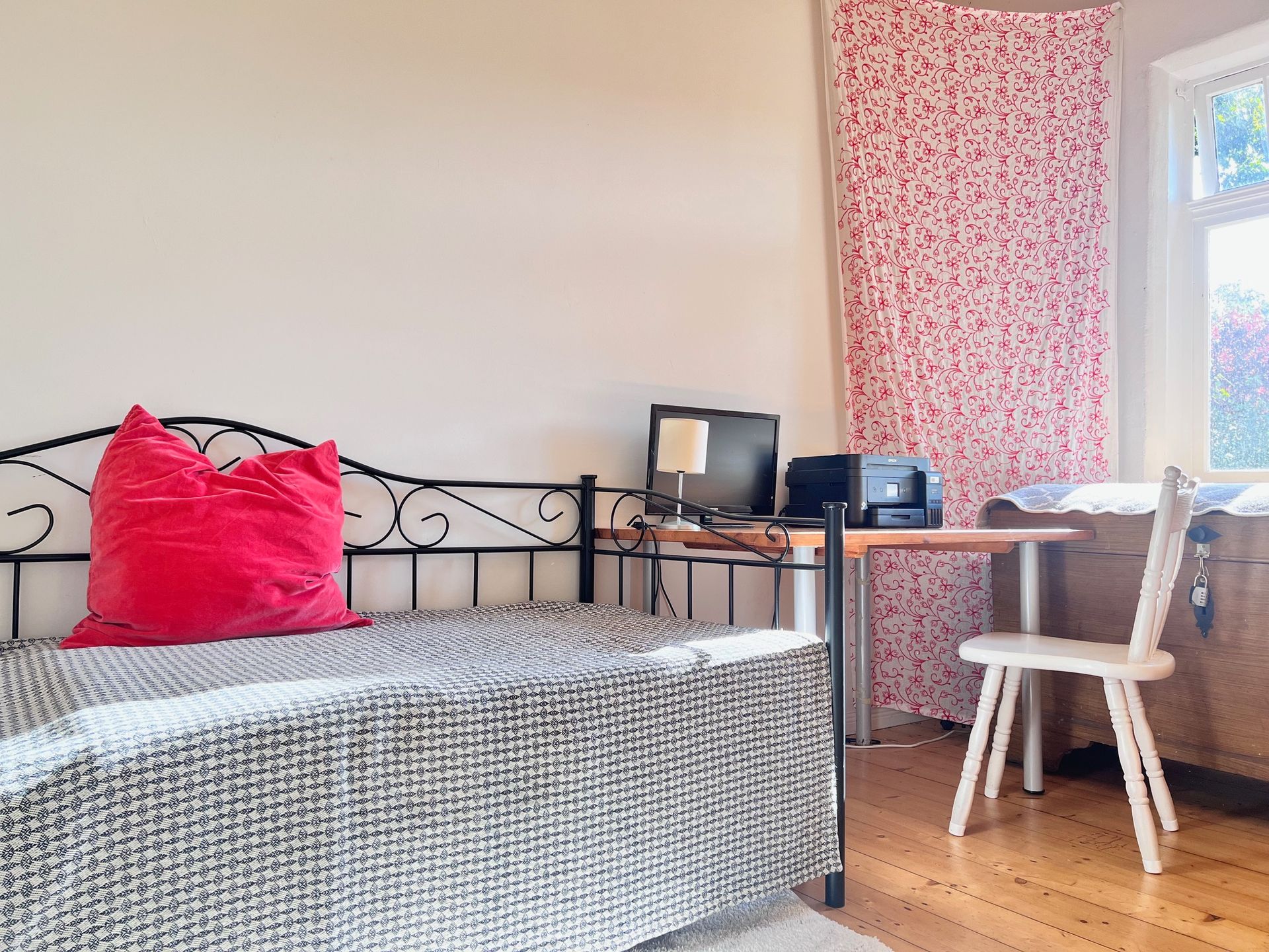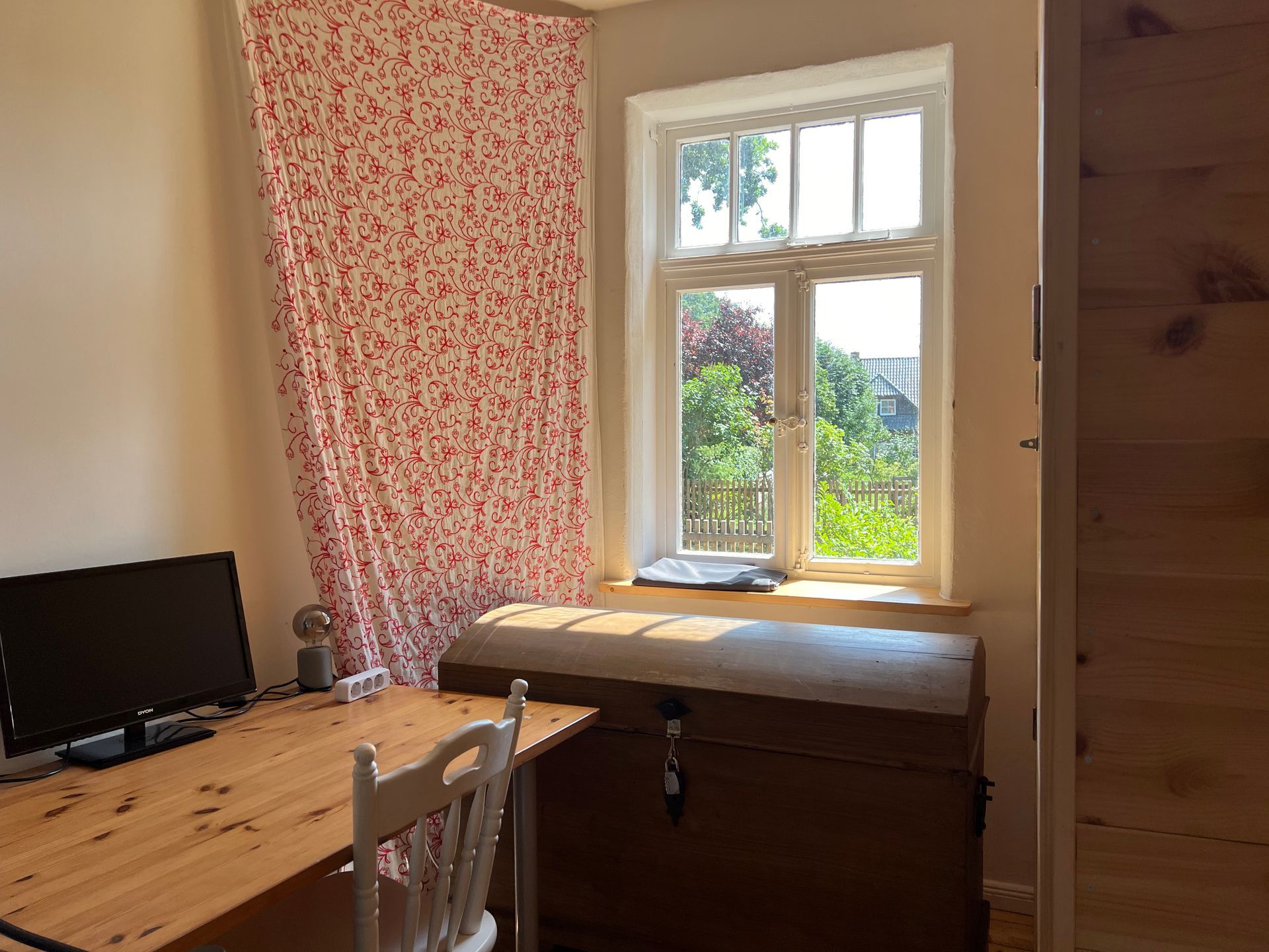 Das Büro kombiniert Schlaf- und Arbeitsraum – ideal für alle, die zwischendurch etwas erledigen möchten oder gern sehr ruhig und abgeschieden schlafen. Ein Schreibtisch samt Drucker steht bereit. Bitte beachten: Da es keine beheizten Räume daneben gibt, wird das Zimmer im Winter über zwei Heizungen warmgehalten. Ein stiller, konzentrierter Ort für Menschen, die bewusst ihren Rückzugsraum suchen.