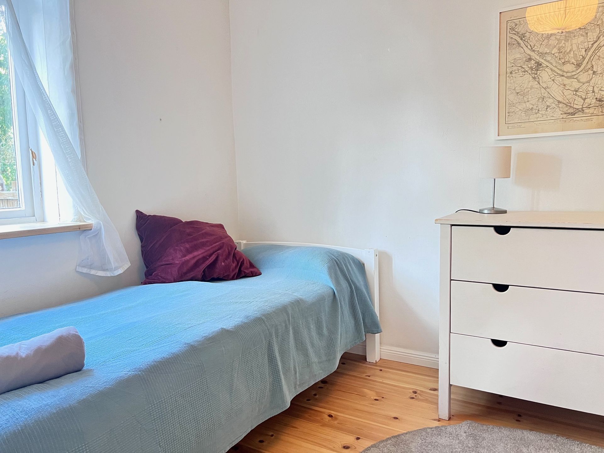 Das Rosenzimmer liegt direkt neben dem Sonnendeck und ist damit ein wunderbares Ergänzungszimmer für Familien. Zwei Einzelbetten bieten Kindern einen sicheren und ruhigen Schlafplatz im „gefangenen Raum“ neben dem Sonnendeck. Babyphone-Reichweite zu den Räumen im Erdgeschoss sowie zur Terrasse ist problemlos vorhanden – die Kinder schlafen entspannt, während die Eltern den Abend in Ruhe ausklingen lassen können.