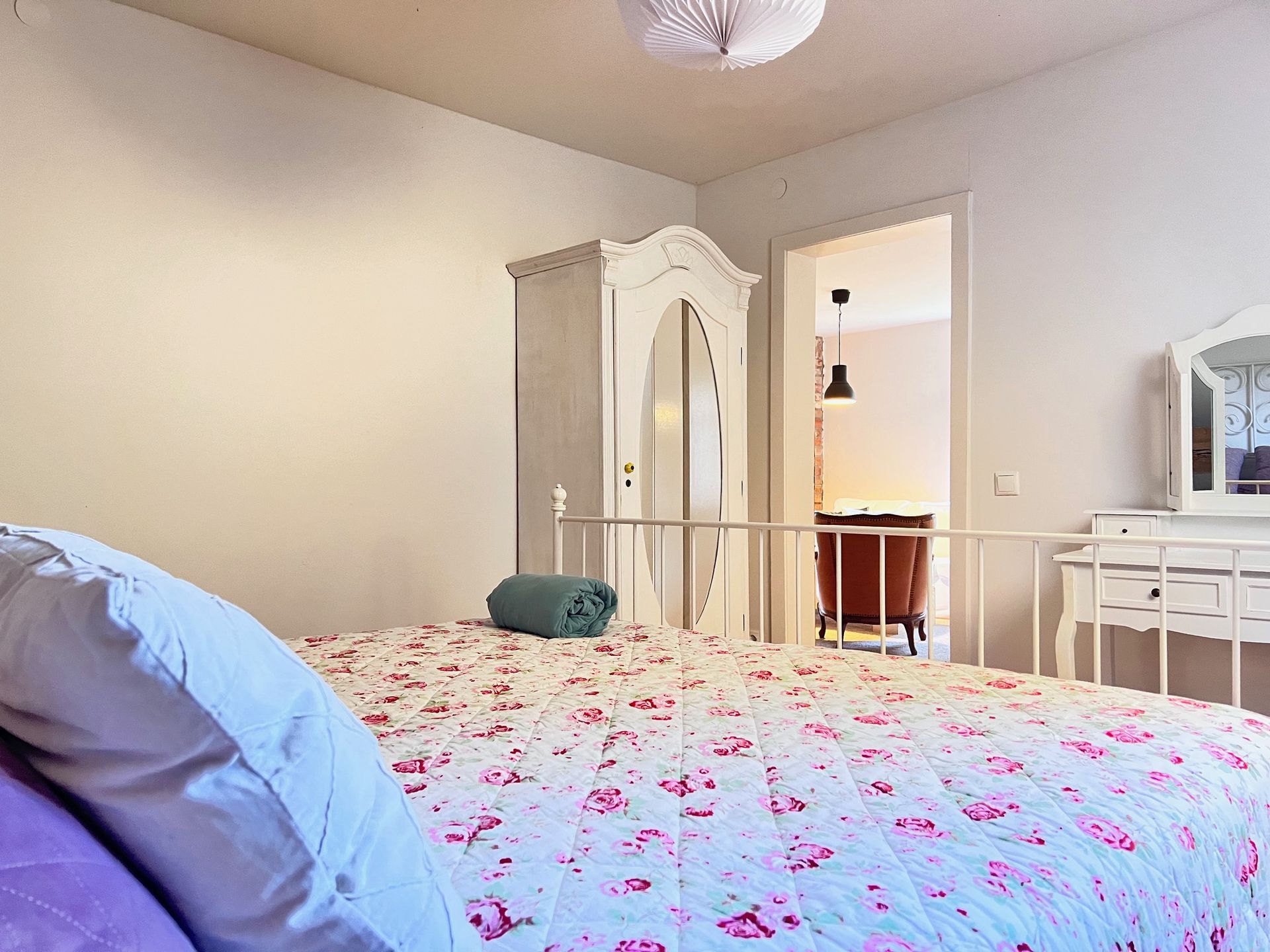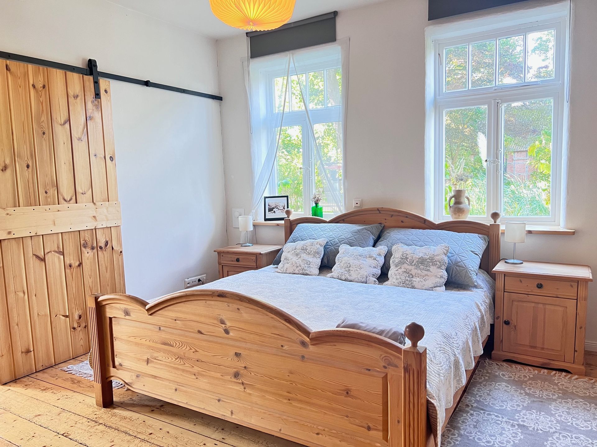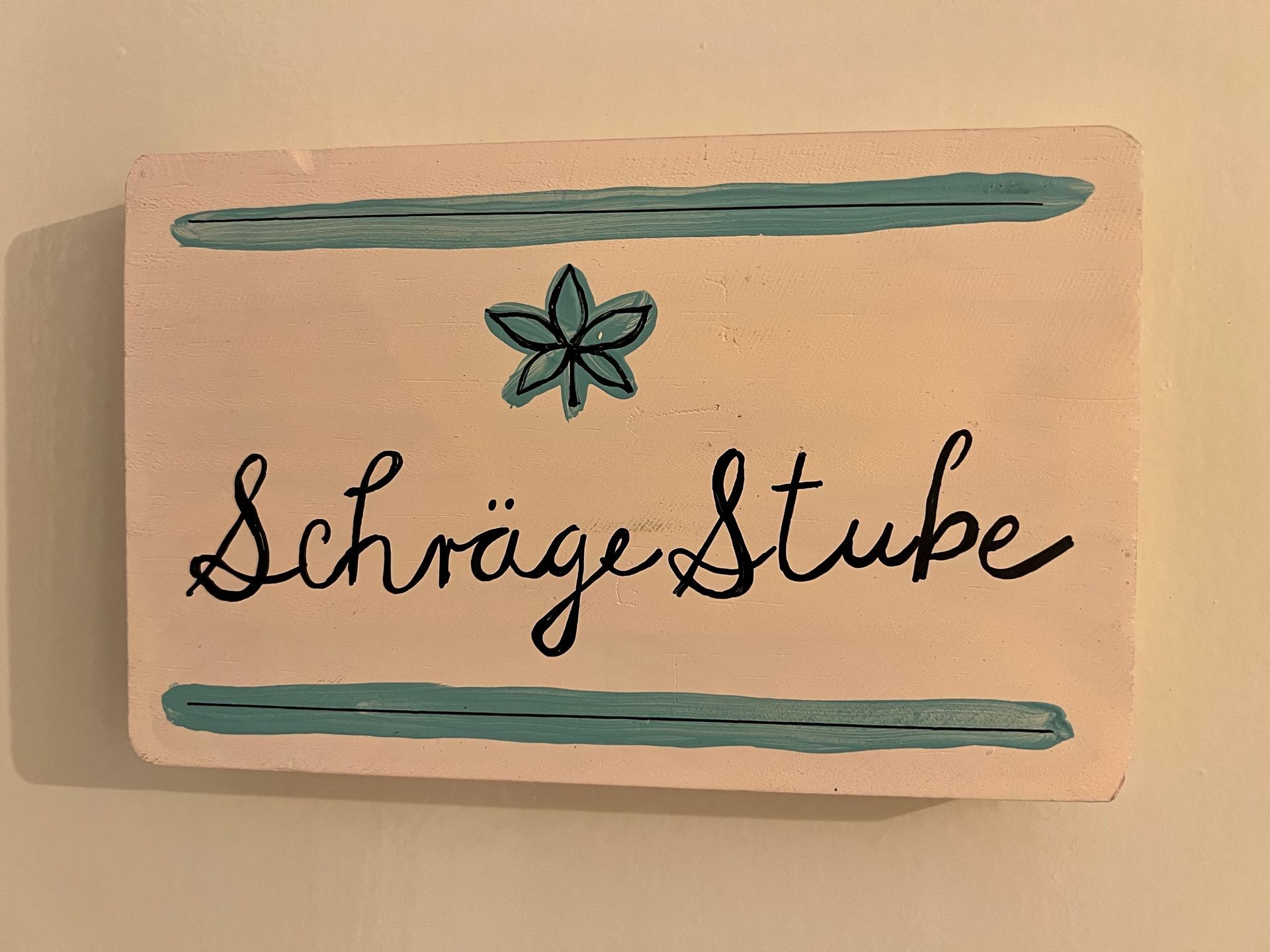 Die Schräge Stube begrüßt Euch als erstes Zimmer im Obergeschoss. Der direkte Zugang zum gegenüberliegenden Badezimmer macht es besonders praktisch für alle, die nachts kurze Wege schätzen. Ein liebevolles Extra: der eigene DVD-Player samt großer Filmsammlung – perfekt für einen entspannten Fernsehabend zu zweit oder eine kleine Auszeit für sich selbst.